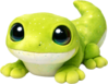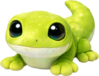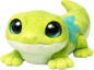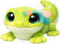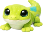 A bright, lime-green gecko plush with a soft velvety texture and a creamy underbelly, dotted with tiny speckles like stardust. Its oversized glossy eyes and gentle smile give it a curious, friendly look, while its splayed little feet and curled tail add a playful, clingy charm perfect for cuddles.
