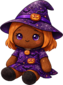 A twilight-themed witch plush with rich brown skin tones and glowing purple eyes, wearing a darker Halloween robe covered in bats and webs. She feels cozy, magical, and perfect for late-night spooky season vibes.