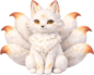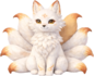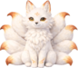 A graceful fox spirit plush inspired by legendary kitsune folklore. This plush features a slim, elegant body and multiple flowing tails that fan out behind it, creating a dramatic and magical silhouette even while seated. Soft white to pale cream fur is accented with subtle warm peach, red, or golden highlights along the ears, face, and tail tips. Large expressive eyes give a calm, knowing gaze, while a small stitched smile adds a serene, gentle personality. The overall look is refined and mystical, leaning enchanted rather than feral.