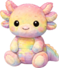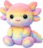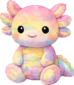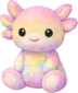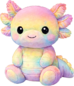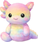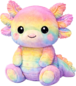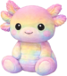 A vibrant rainbow axolotl plush bursting with soft pastel hues that blend seamlessly across its body. Its frilly gills shimmer with multicolour charm, and its sweet expression gives it a joyful, magical feel-like a tiny bundle of colour and happiness.