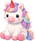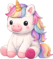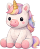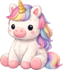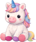 A magical unicorn plush with a soft white body, pastel rainbow mane and tail, and a shiny golden horn. Its gentle expression, rosy hooves, and flowing colors give it a dreamy, whimsical look straight out of a fairytale.